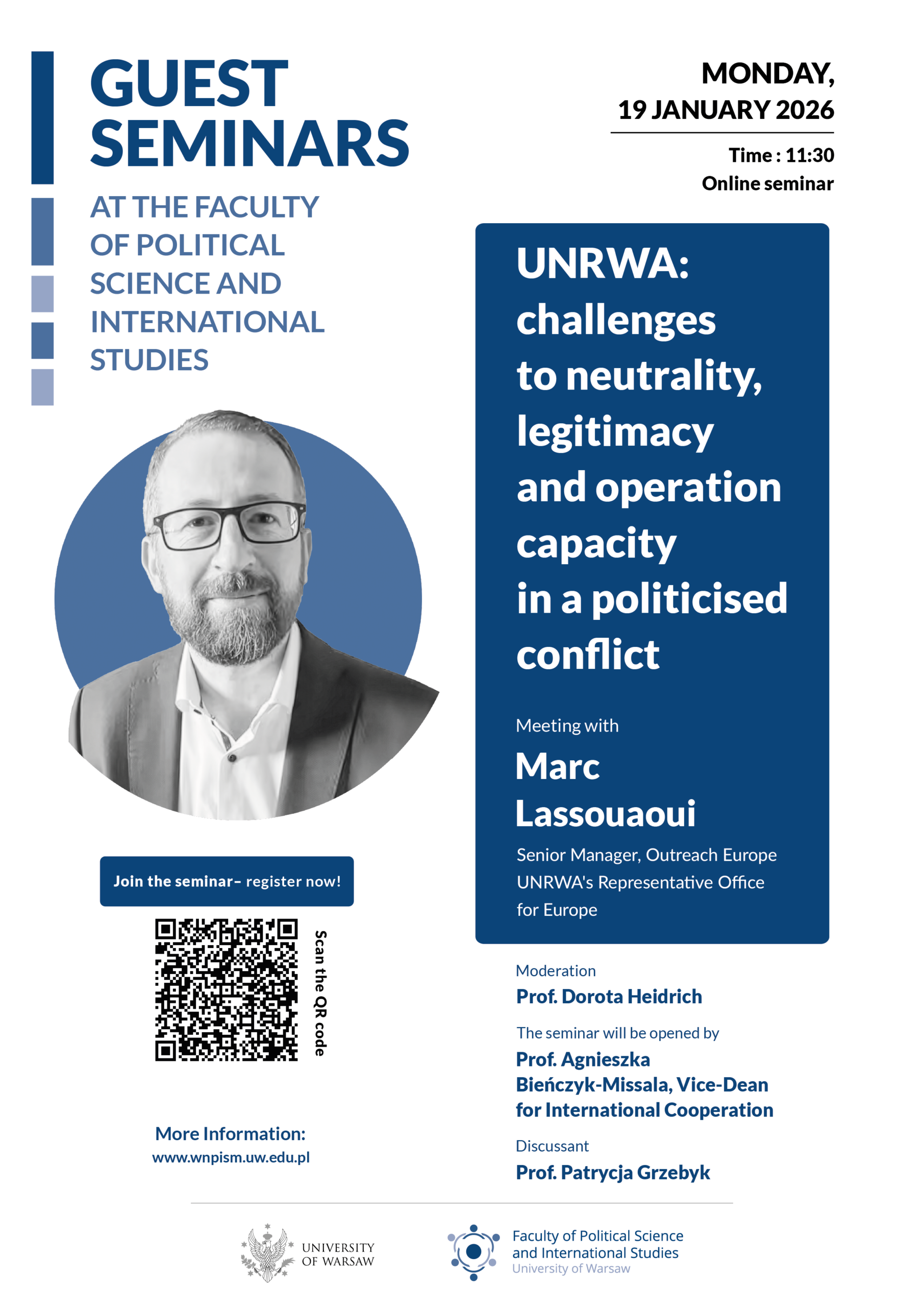 The discussion will address the multifaceted challenges facing the United Nations Relief and Works Agency for Palestine Refugees in the Near East (UNRWA). In an era of increasing politicization, the seminar will explore how the Agency maintains its commitment to neutrality and legitimacy while ensuring operational continuity. Key topics will include the impact of political pressure on humanitarian mandates and the strategies used to secure resources and partnerships across Europe and beyond.