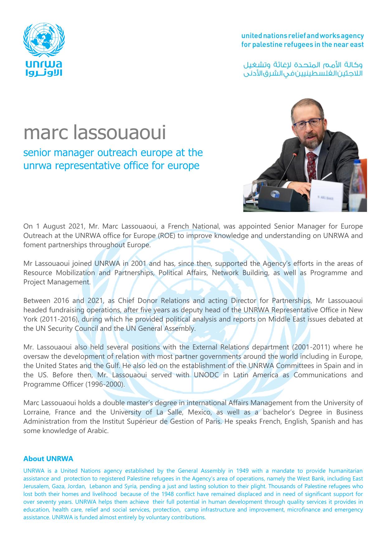 Marc Lassouaoui was appointed Senior Manager for Europe Outreach at the UNRWA Representative Office for Europe (ROE) in August 2021. His mission is to enhance the understanding of UNRWA’s mandate and foster strategic partnerships across the continent. Since joining UNRWA in 2001, he has held several high-level positions: