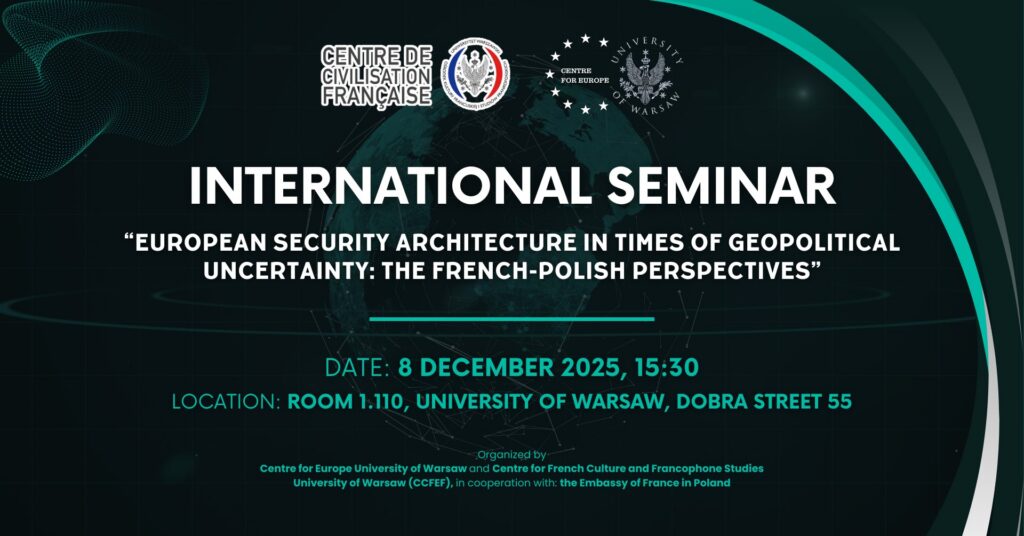 The Centre for Europe of the University of Warsaw and the Centre for French Culture and Francophone Studies of the University of Warsaw invite you to the International Seminar “European security architecture in times of geopolitical uncertainty: the French-Polish perspectives.”
