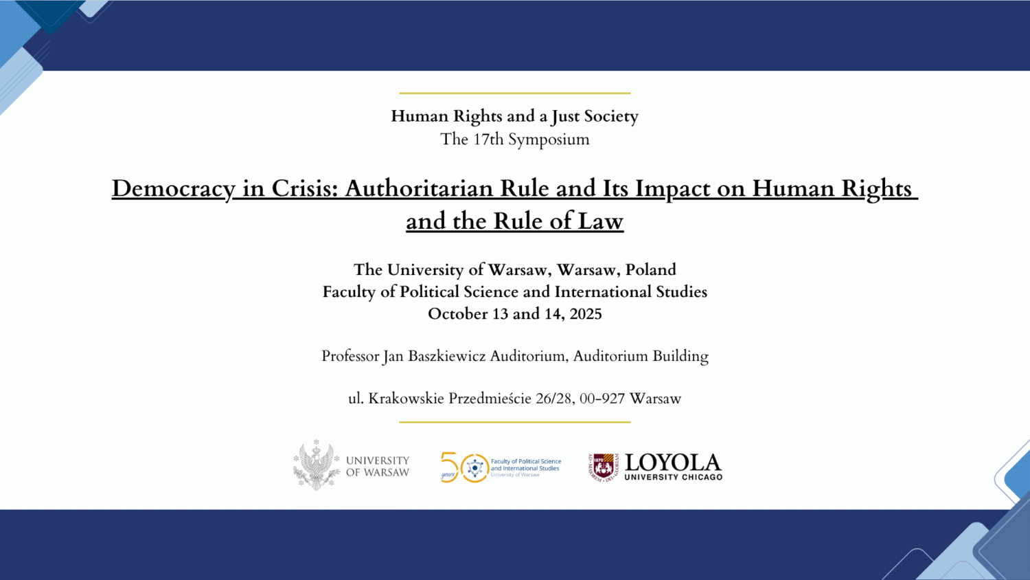 W imieniu Wydziału Nauk Politycznych i Studiów Międzynarodowych Uniwersytetu Warszawskiego oraz Loyola University Chicago – John Felice Rome Center, zapraszamy na międzynarodową konferencję Human Rights and a Just Society – The 17th Symposium, która odbędzie się w dniach 13–14 października br. w Auli im. prof. Jana Baszkiewicza w Gmachu Audytoryjnym UW.