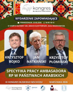 Zapowiadamy ostatnie wydarzenie przedkongresowe, które stanowi zwieńczenie cyklu spotkań poprzedzających III Kongres Bliskiego Wschodu. Tym razem uczestnicy panelu będą mogli skupić się na identyfikacji kluczowych cech i kompetencji niezbędnych do kierowania placówką dyplomatyczną RP na Bliskim Wschodzie. Praca Ambasadora Rzeczypospolitej Polskiej w państwach arabskich to zadanie wymagające wyjątkowych kompetencji. Odmienność norm społecznych, silna rola tradycji i religii oraz dynamiczna sytuacja polityczna regionu sprawiają, że kierowanie polską placówką dyplomatyczną w krajach Ligi Państw Arabskich jest wyzwaniem o szczególnej skali złożoności. Gośćmi amb. Krzysztof Bojko, amb. Jan Natkański i amb. Krzysztof Płomiński. Prelegenci panelu to wybitni przedstawiciele polskiej dyplomacji, których doświadczenie zawodowe koncentruje się wokół Bliskiego Wschodu i Afryki Północnej. Łączą wieloletnią praktykę ambasadorską z działalnością ekspercką i naukową, posiadając unikalną perspektywę na funkcjonowanie polskich placówek w świecie arabskim.