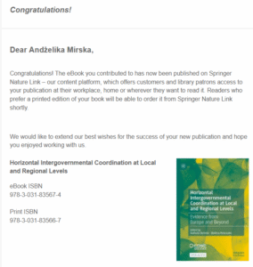 Książka „Horizontal Intergovernmental Coordination at Local and Regional Levels”, Behnke, N., Petersohn, B. (red.), Palgrave Macmillan, https://doi.org/10.1007/978-3-031-83567-4_13) prezentuje wyniki badań nad koordynacją w systemie wielopoziomowego zarządzania w 20 państwach oraz wnosi istotny wkład do międzynarodowej dyskusji nad mechanizmami współpracy między poziomami władzy publicznej w ujęciu wewnątrzpaństwowym.