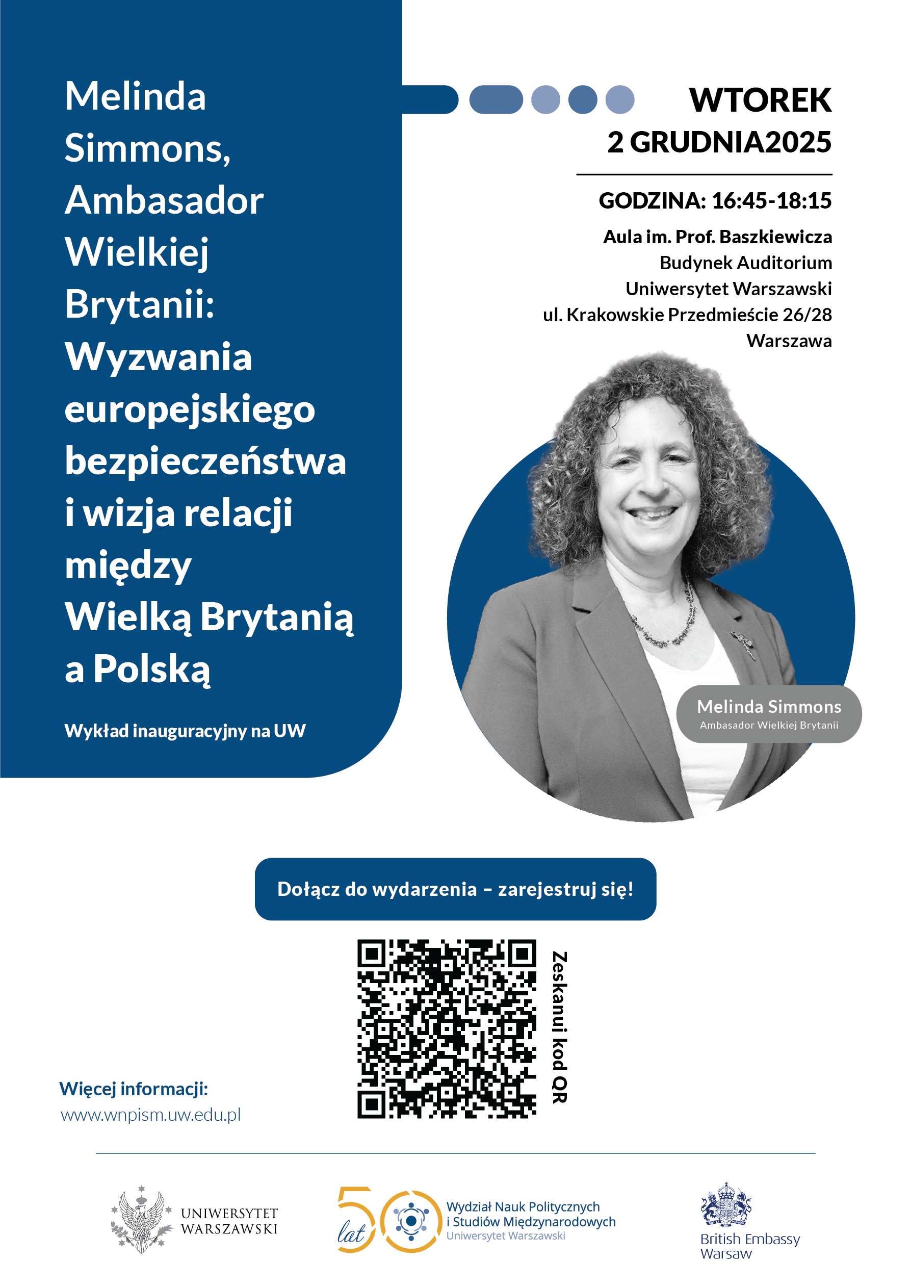 Serdecznie zapraszamy na otwarte spotkanie z Melindą Simmons, która od września 2025 roku pełni funkcję Ambasadora Zjednoczonego Królestwa Wielkiej Brytanii i Irlandii Północnej w Polsce.