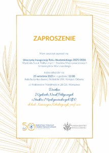 w imieniu Kolegium Dziekańskiego Wydziału Nauk Politycznych i Studiów Międzynarodowych Uniwersytetu Warszawskiego serdecznie zapraszamy na uroczystą Inaugurację Roku Akademickiego 2025/2026, która odbędzie się 25 września 2025 r. (czwartek) o godzinie 12:00 w Auli Starego BUW-u.