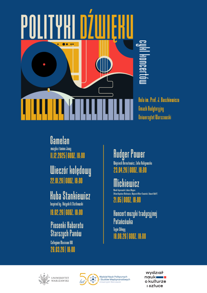 W imieniu dr hab. Katarzyny Kołodziejczyk, prof. ucz., Dziekan Wydziału Nauk Politycznych i Studiów Międzynarodowych UW oraz prof. dr hab. Małgorzaty Karpińskiej, Dziekan Wydziału Nauk o Kulturze i Sztuce UW serdecznie zapraszamy na pierwsze muzyczne spotkanie z cyklu „Polityki Dźwięku”.